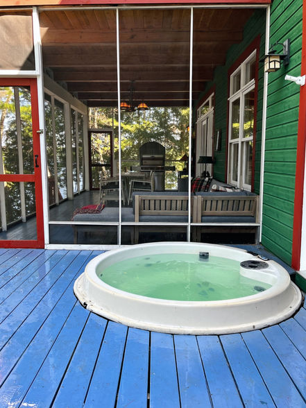 The main floor is open concept with kitchen, dining area (with seating up to 8 people) and vaulted living area. Through two sets of French doors the main floor opens out to a 12’ x 24’ screened in veranda with dining and living areas that flow out to a deck with a sunken hot tub.